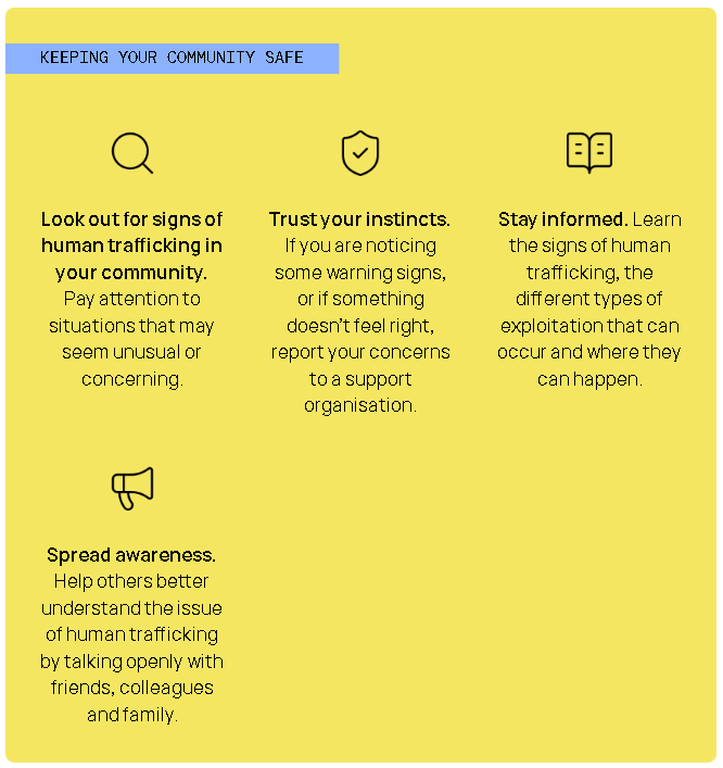 Seeing these kinds of changes in a friend, family member, or someone you know does not automatically mean they are being exploited. However, if you feel someone may be vulnerable or at risk, you can submit a report through our STOP Trafficing (link at the bottom of the page), reach out to a local support organisation, or contact the relevant authorities if there is an immediate threat to anyone’s safety. all information has been provided for you to help your self or someone else.